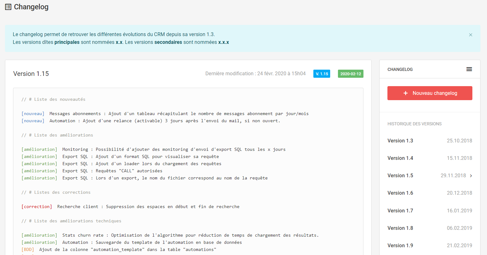 Certaines de ces remarques m’ont permis d’améliorer des aspects du CRM par la suite mais aussi de corriger des bogues non détectés sur les tests. À la suite de ces formations, j’ai pu remarquer qu’il y avait des utilisateurs qui n’étaient pas au courant de certaines fonctionnalités du CRM puisqu’ils n’avaient pas forcément eu l’information jusqu’à eux. De ce fait, j’ai décidé d’ajouter un “Changelog” directement dans le CRM pour que tous les utilisateurs puissent être au courant des changements mineurs ou majeurs du CRM (en plus du mail envoyé à chaque mise à jour majeure de celui-ci).