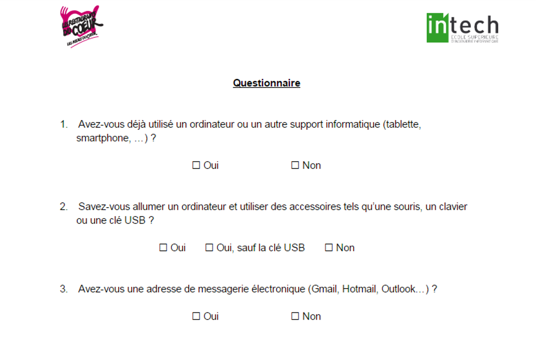 Durant mon cursus à IN'TECH Sud, j'ai eu l'occasion de faire partie d'un projet de formation humain, avec Yoan HABIB et Victor AMBLARD, en partenariat avec les Resto du cœur. L'objectif de ce projet a été de créer et de mener différentes formations en informatique (principalement sur de la bureautique) à des bénévoles, des salariés mais aussi des accueillis.